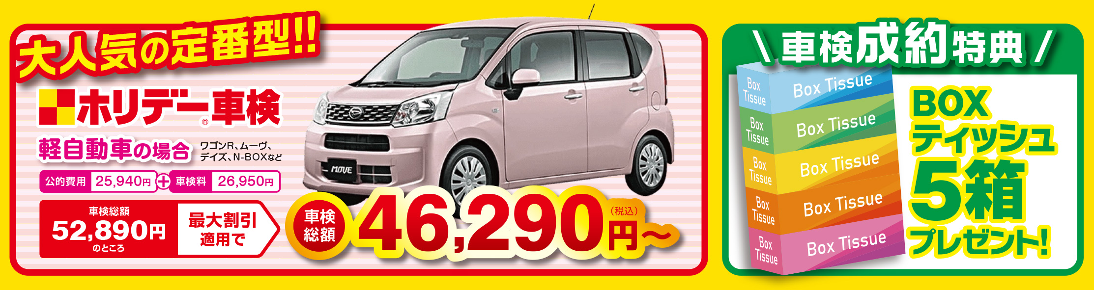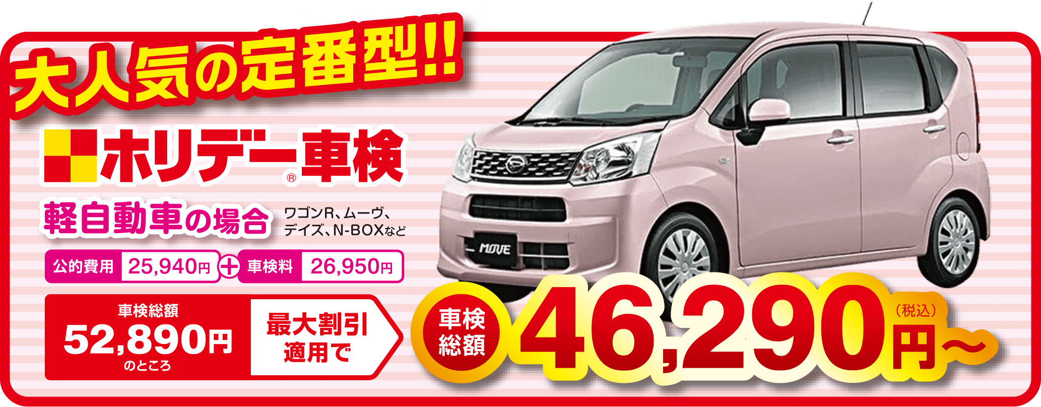●納税証明書を必ずご持参ください。●部品代金、整備代金は別途料金になります。●輸入車の取り扱いはお問い合わせください。●「法人」並びに「事業用」登録の車はお問い合わせください。●違法改造車は車検できません。●4WD車、ワンボックス車は別途3,300円が加算されます。●ダブルタイヤ車およびキャンピングカーは別途5,500円が加算されます。●大きな整備がある場合は当日車検ができない場合があります。●重量税はエコカー減税非対象車で初年度から13年未満の税額です。その他のお車につきましては異なりますのでお問い合わせください。●上記の車種以外はお問い合わせください。