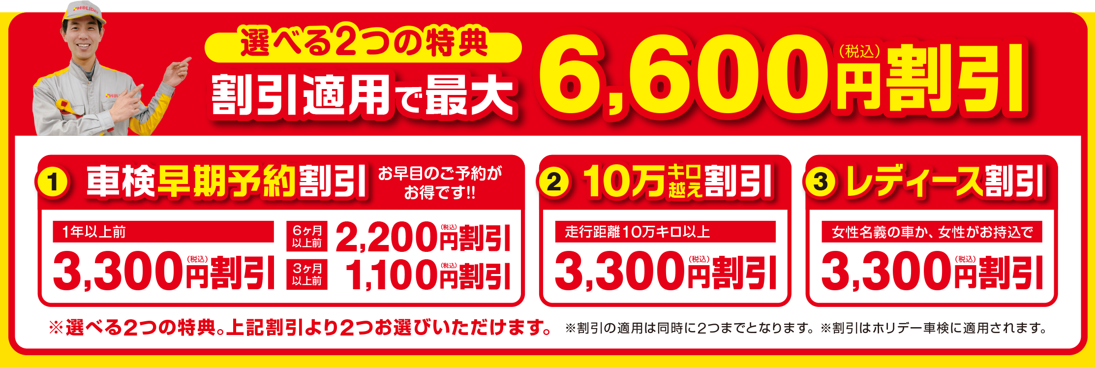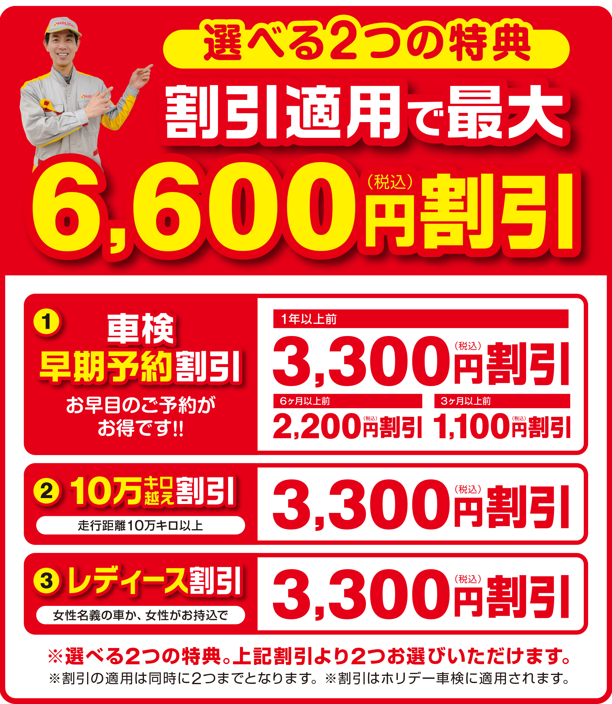 ●納税証明書を必ずご持参ください。●部品代金、整備代金は別途料金になります。●輸入車の取り扱いはお問い合わせください。●「法人」並びに「事業用」登録の車はお問い合わせください。●違法改造車は車検できません。●4WD車、ワンボックス車は別途3,300円が加算されます。●ダブルタイヤ車およびキャンピングカーは別途5,500円が加算されます。●大きな整備がある場合は当日車検ができない場合があります。●重量税はエコカー減税非対象車で初年度から13年未満の税額です。その他のお車につきましては異なりますのでお問い合わせください。●上記の車種以外はお問い合わせください。