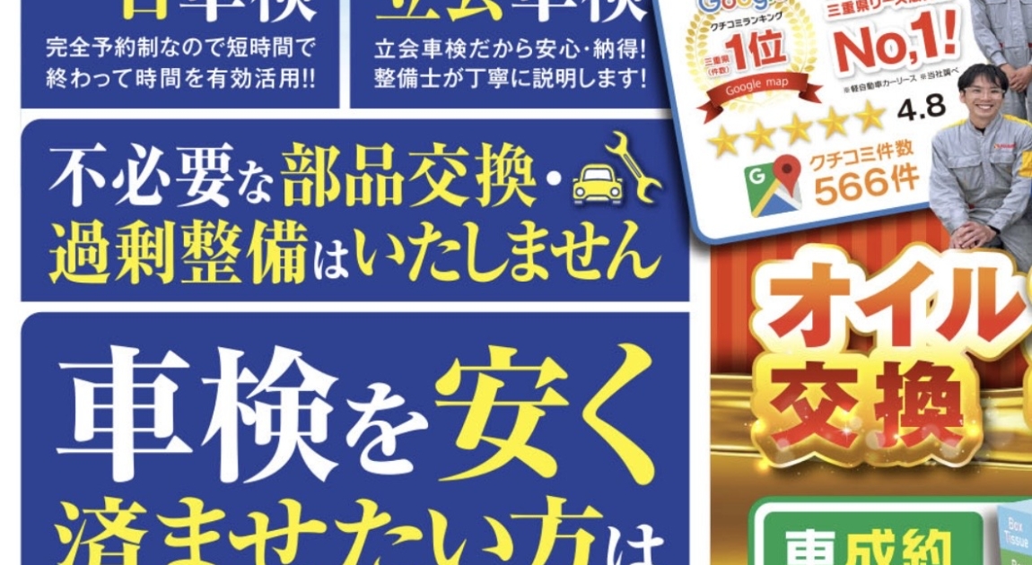 実は、3月は新車が一番売れる時期。そのため、3年後、5年後の車検満了日も3月に集中するんです。四日市市内を走っているお車の多くが、今まさに車検のタイミングを迎えています。